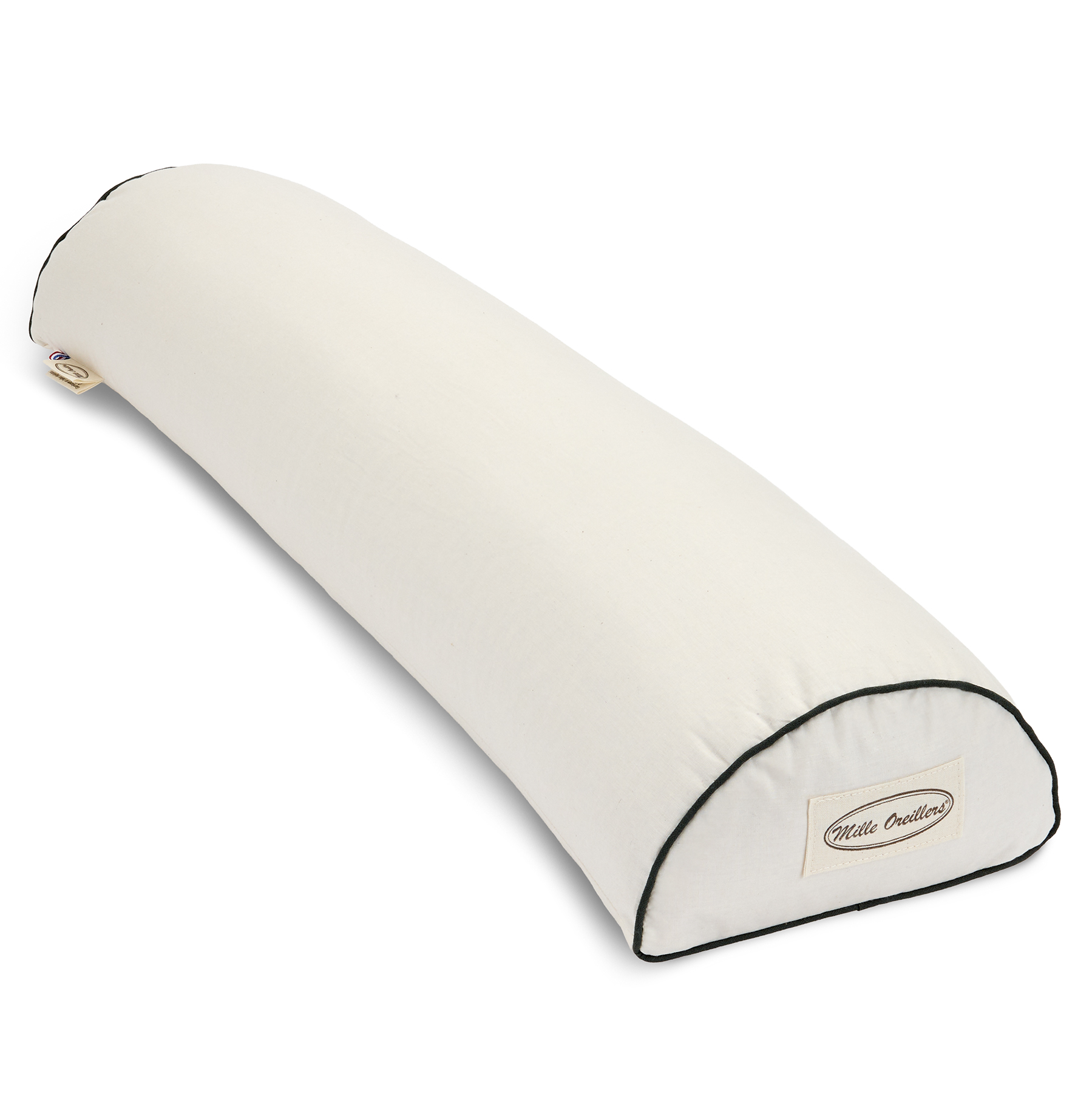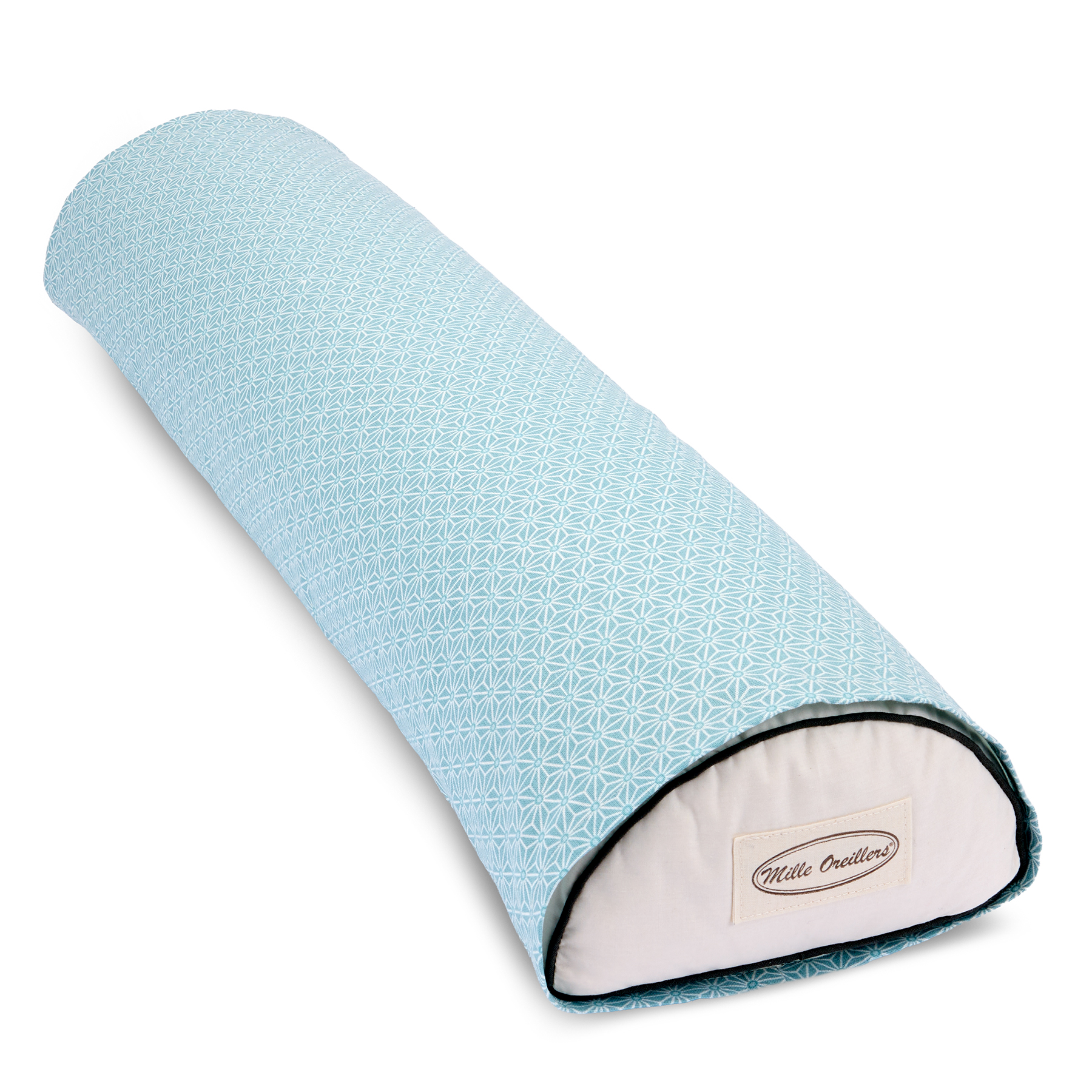 Fourni avec une taie en coton motif traditionnel Asanoha (« fleur de chanvre »), également proposée séparément pour le change, voir plus bas en « Article suggéré », sous le nom de Taie coton Asanoha pour Bolster de yoga demi-lune 15 x 8 x 65 cm , réf. TBOL4.