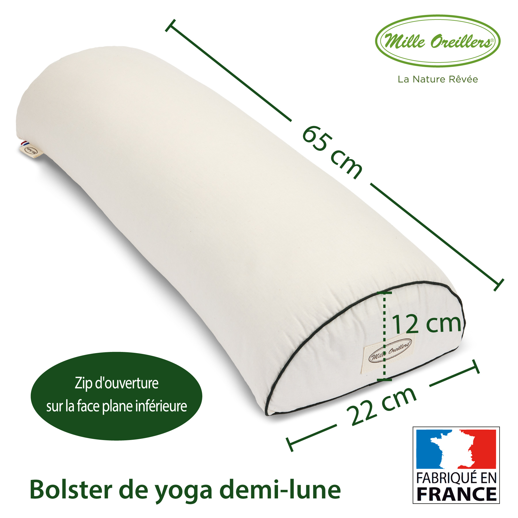 Fourni avec une taie en coton motif traditionnel Asanoha (« fleur de chanvre »), également proposée séparément pour le change, voir plus bas en « Article suggéré », sous le nom de Taie coton Asanoha pour Bolster de yoga demi-lune 22 x 12 x 65 cm , réf. TBOL3.