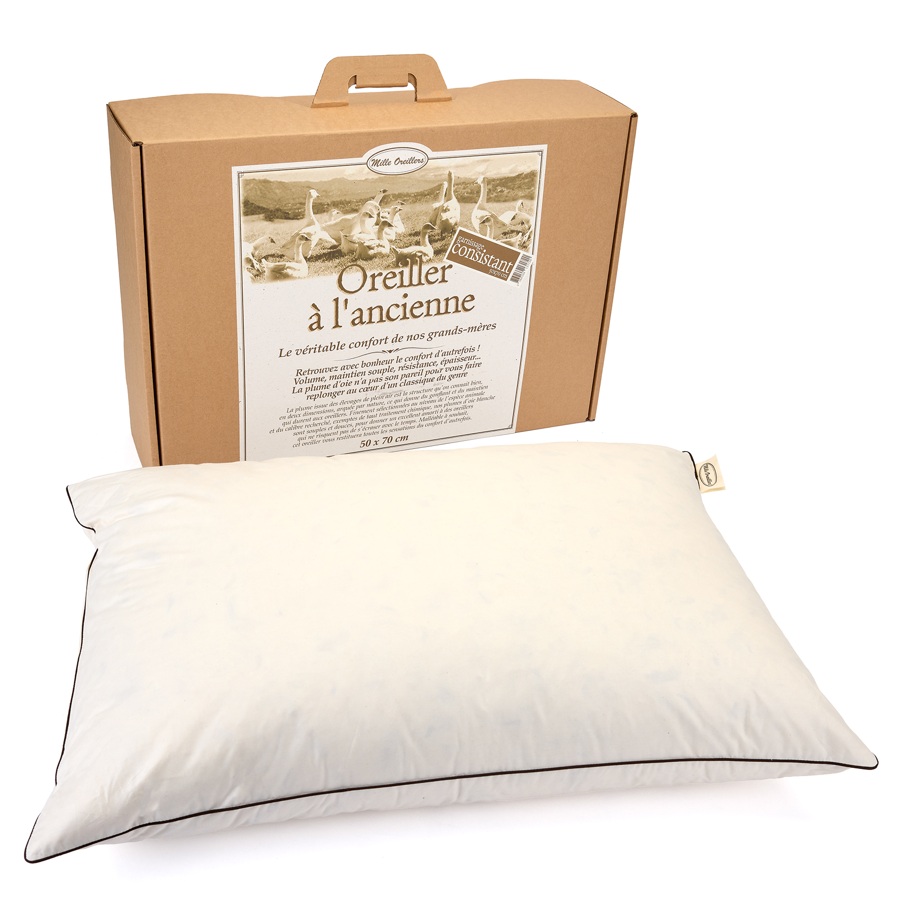 Vous retrouverez ici la densité, le poids et l’épaisseur des oreillers de plume d’autrefois, d’une résistance à la compression à toute épreuve, tant ils sont fortement rembourrés.
