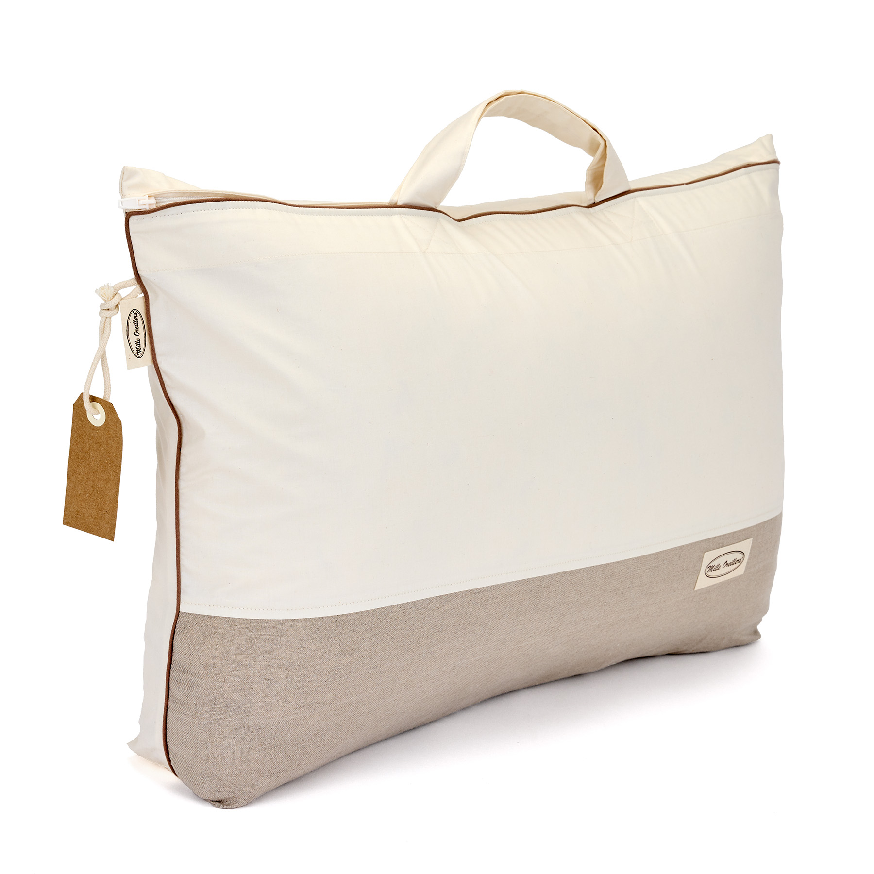 Conception bi-matière en percale 100% coton et lin pur fil, tous deux certifiés issus de l’Agriculture Biologique, aspect dans la couleur naturelle des fibres avec fermeture à glissière plastique sans aucune présence de métal.